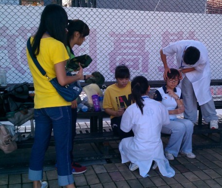 期间,有部分新生由于耐不住高温晕倒或出现身体不适的,医疗小组的成员热心细致地为他们量体温,按摩,充分体现了岭南的大爱精神。