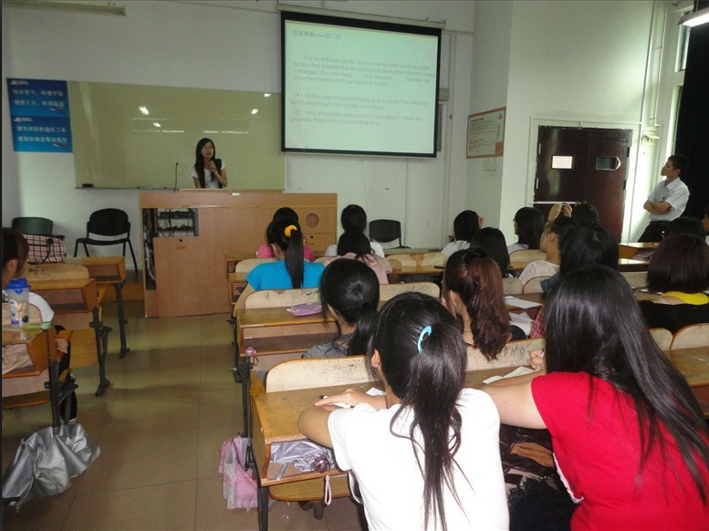 交流会上,郑老师先对英语四级考试题型作详细地讲解,强调听力和快速阅读占四级总成绩的75%。听力要注意技巧,记住相应的要点,听懂第一句话或者大意,而且要在平时加强词汇量,为写作文、做阅读理解打下基础。同时注重积累文章,在写作中尽量使用新颖的短语、词汇、句式、闪光词抓住评委的心。在考试前的复习需要做好充分的准备,第一阶段是基础巩固(即背单词);其次是真题的训练(寻找2000年之后的听力真题、2006年之后的阅读真题);最后是冲刺阶段,应反复看做过的真题,还有在考试前应先写作文模板等。