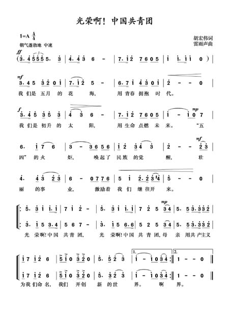 1988年5月8日,共青团第十二次全国代表大会通过了《关于确定代团歌的决议》,决定《光荣啊,中国共青团》(胡宏伟词、雷雨声曲)为中国共产主义青年团代团歌。