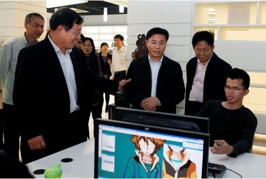 随后,来宾一行参观了星力量动漫游戏学院的星力量动漫工厂、外贸人才公共培训基地——同声传译室、金融廊。领导一行与我校领导在图书馆807室开展了简短的交流会。会上,郑建荣副厅长首先提出“服务外包人才机构要与企业建立紧密结联系”。对此,俞仲文校长回应并提出了两点设想:其一,加强与企业的结合,我校国际服务外包项目才刚起步,有很多想法,呼吁产业促进会与我校合作,在我校成立外包企业服务中心。其二,考核与支持并重,国际服务外包学院的考核形式可以与企业专家合作,希望有大企业的专家前来担负培养教师的工作,可以合办课程并共同制定培训标准。对此,郑建荣副厅长回应道:“培训机构与企业要互动起来”。