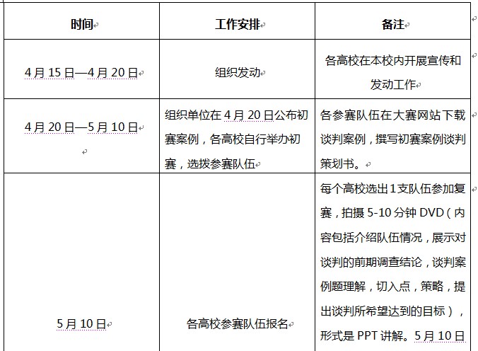 大赛组委会根据各参赛团队撰写的谈判策划书、PPT形式讲解(DVD视频)进行评定(分值各占50%),确定出8支队伍分成4组对决,进行复赛(复赛队伍名单5月15日公布)。