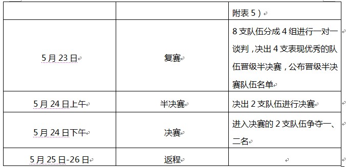 2.复赛:5月23日。进入复赛的8支团队进行现场比赛,决出4支团队进入半决赛(当场公布进入半决赛的团队)。