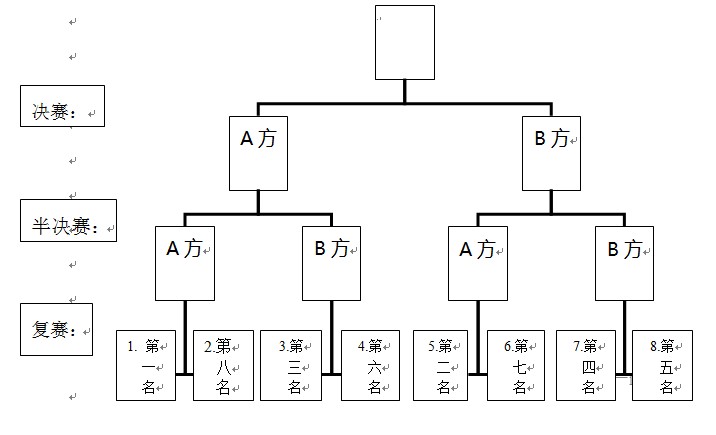 1.复赛,初赛胜出的八支队伍,将对他们进行初赛成绩排名进行复赛的对垒。八至队伍的参赛出场顺序如图所示,并将八支队伍按如图编上标号1,2,3,4,5,6,7,8。编号单数(1,3,5,7)自动生成商务谈判复赛的A方,编号双数(2,4,6,8)自动生成复赛的B方。