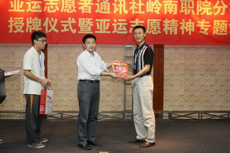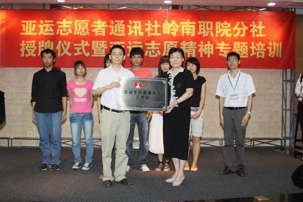 接着,党委副书记程翠英代表我院接过“亚运志愿者通讯社工作站”牌匾,团委书记卜佳锐接过赠刊《志愿者》、赠报《亚运先锋》。这标志着我院和中大、华工、华师等多所高校一样,正式参与到亚运志愿者通讯报道的行列中来。