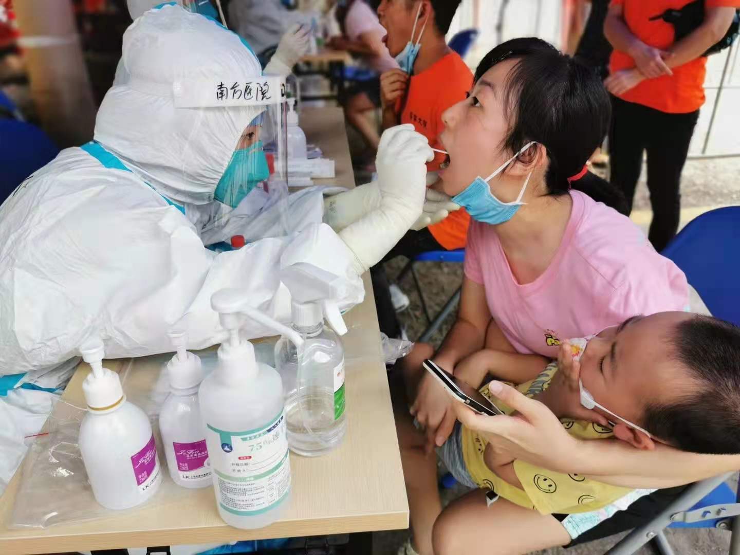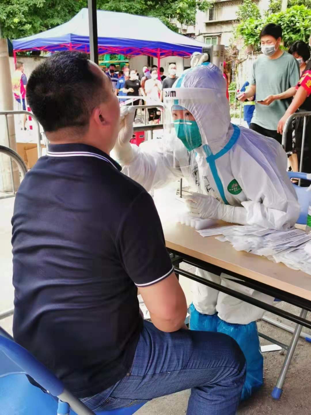 从去年湖北那场战疫里扛过来,对比今天的工作,何丽娜坦言能坚持。“有休息,2-3个小时一班,相对来说,我觉得是轻松的,不累。这比我想象中的好很多,都能能扛得住。”除了热。广州炎热的高温,让装在防护服里的每个人都觉得吃不消。“风扇的风吹不进去,我就拿着一瓶一瓶的冰水给自己降温。古有抱团取暖,今天抱冰消暑。”温度降下来,继续做核酸检测工作,一晃几个小时就又过去了。