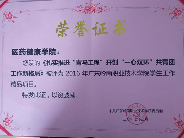 李迪龙老师所负责的《扎实推进“青马工程”开创“一心双环”共青团工作新格局》被评为2016年广东岭南职业技术学院学生工作精品项目