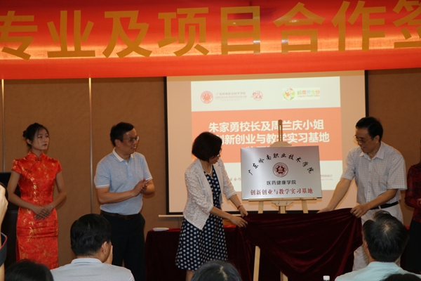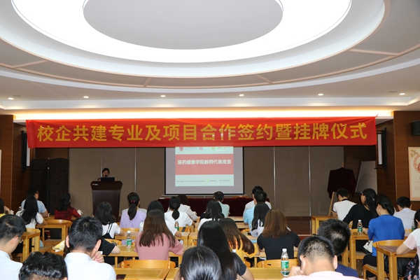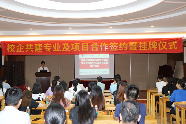 为加强校企联合,促进资源优势互补,实现互惠双赢、共同成长,6月6日上午,医药健康学院与养生谷公司在C栋一楼学术报告厅举行了校企共建专业与项目签约暨挂牌仪式。在岭南教育集团和学校领导的大力支持下,双方将在护理照料、健康营养、医检体检和中西药房等领域进行深度合作,进而探索共建养老院、康复医院、护理院。本次签约与挂牌仪式由医药健康学院何永佳副院长主持。