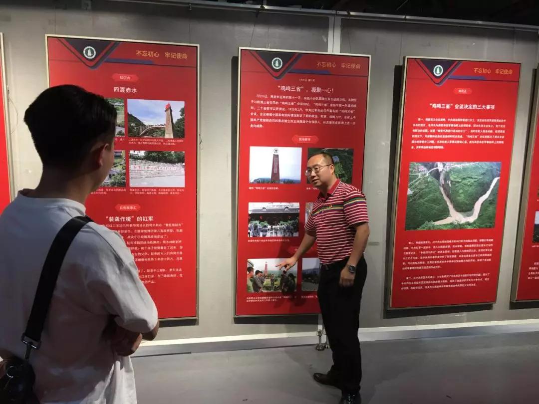 14日下午3时许,全体教师党员到达主题展览馆,展览馆负责教师简单的向大家介绍了 “长征路上话初心”主题实践教育的情况和展览馆的分布格局。之后余生书记先带领大家观看“话初心”视频纪录片,接着带领大家一一驻足每一幅实践活动的书画和摄影作品之前,详细阅读每一幅图片的内容,深入了解该活动走过的长征之路和实际开展的纪念活动。对图片中提到的长征著名地点和背后的革命故事与精神,余生书记亦向所有参展党员教师详细的讲解,并与大家进行讨论交流。
